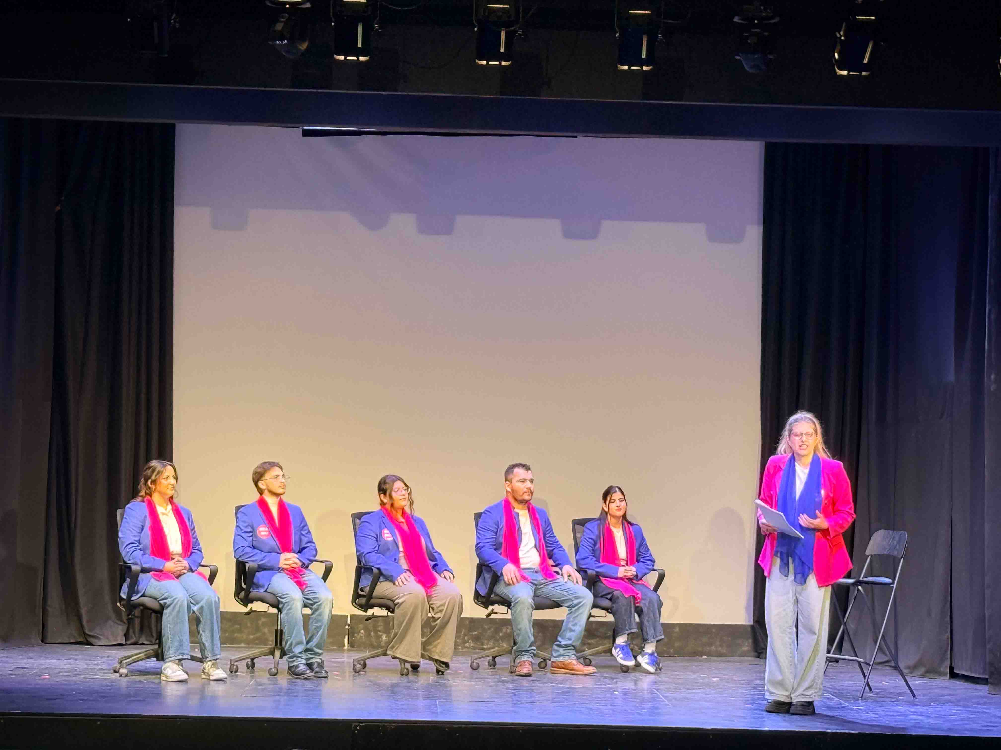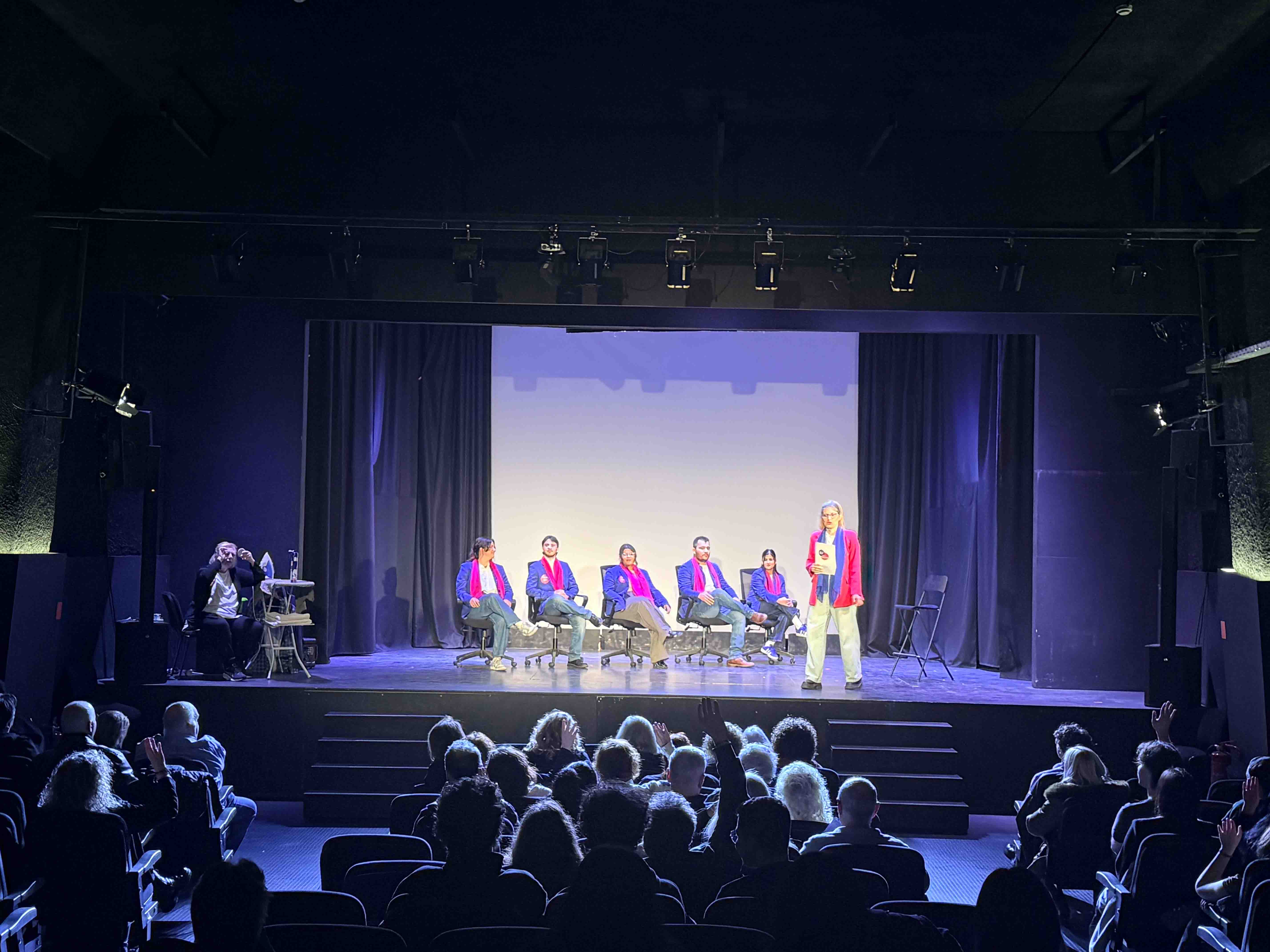 The event combined theatrical scenes with direct audience engagement. It opened with participatory questions about silence, emotional pressure, and hurtful words, then moved through dialogue scenes, a silent performance sequence, a monologue on conformity and self doubt, a collective song about solidarity, and a closing civic message about institutional responsibility and youth voice.