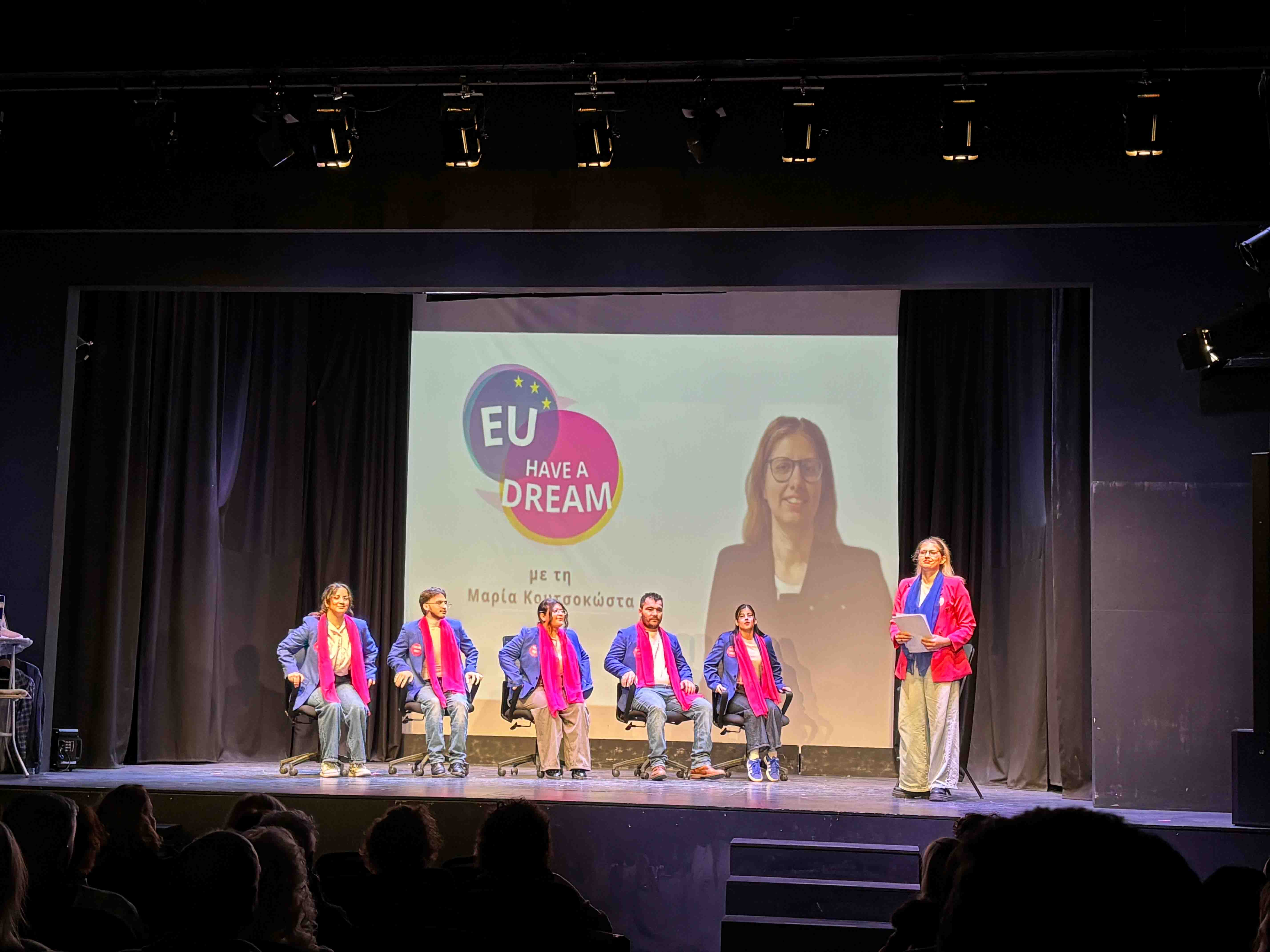 The second Theatre Debate in Greece took place on 30 March 2026 in Thessaloniki, at the Theater of Arts in the city centre, following a rehearsal period carried out between January and March at Lissasmeni Gata. The event focused on European identity, economy, and the relationship between Greece and the European Union, bringing together young people, civic and youth organisations, politicians, and members of the local community. Framed as a live TV show, “EU HAVE A DREAM, A DREAM DEBATE, THE TV SHOW,” the performance created a space where young people’s voices could be heard by peers, citizens, and decision makers.